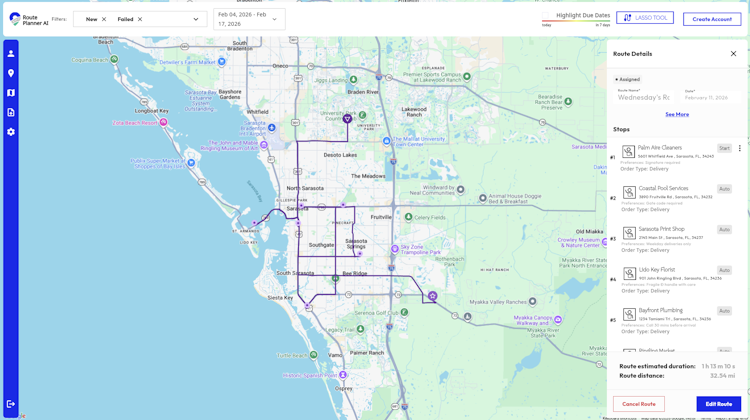 Route Planner AI is comprehensive route planning and delivery management software designed for route-based service, field service and delivery teams. The system combines AI-powered route optimization with integrated customer relationship management capabilities. The platform supports industries such as beverage distribution, logistics, document shredding, pest control, food and beverage distribution, commercial waste pickup, HVAC repair, water delivery, field sales, mobile notary services, construction material delivery and laundry services. The software provides a centralized environment for planning multi-stop routes, managing customer data and dispatching instructions to mobile devices.