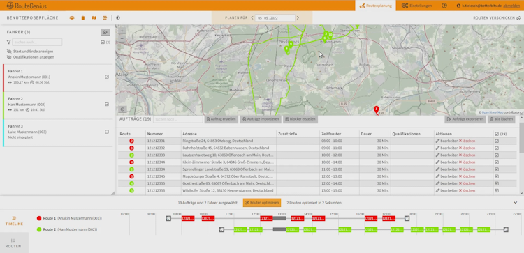 RouteGenius takes into account the duration and time of breaks. These breaks are placed in such a way, that an optimal number of orders can be fulfilled.