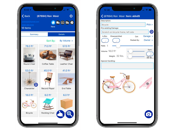 Speedy Inventory’s native apps for iOS and Android allow moving crews to scan items, take photos, and capture customer signatures. Items are color-coded with scannable labels, which allows crews to scan items at pickup, transfer, and final delivery, to add them to the cloud database and update their status. Through the app, crews can access lists of all items not yet scanned for the current stage, ensuring that no items are forgotten. All items are photographed at pickup, enabling the recording of any existing damage and providing images to compare for any items which are damaged during the move. Customer signatures can be captured at pickup and delivery, and the forman can sign off electronically during transfers.