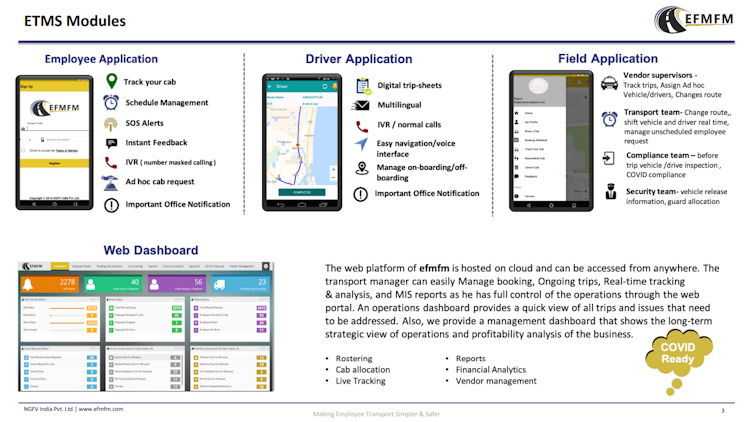 TrackReal is a complete employee transportation management system (ETMS or ETS). Enterprise clients can benefit from the highest level of employee convenience and the greatest cost savings with EFMFM. Besides safety features for female employees, feedback management, a dashboard for C-level executives, operational analytics, and a driver rating system, COVID compliance is also included.