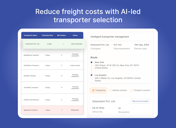 Transport Management System is a cloud-based software that streamlines logistics processes from planning and procurement to execution tracking and auditing. The system features AI-enabled transporter selection that automatically chooses carriers based on parameters such as cost, risk score, and availability. It incorporates multi-layered tracking capabilities including GPS, SIM, and IoT technologies with fallback mechanisms to maintain shipment visibility.
