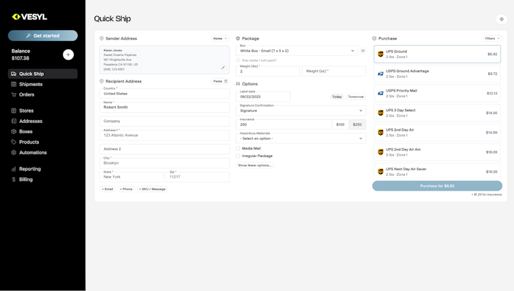 VESYL integrates seamlessly with platforms like Shopify, WooCommerce, Amazon, Etsy, and more, pulling in orders and syncing tracking updates in real time. Built-in analytics provide insight into shipping spend and performance, so you can ship smarter as you scale.