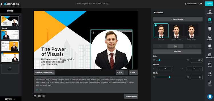 AI Studios is a video making solution with key features that include video creation, video editing, and more.