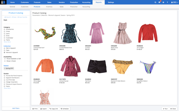 ApparelMagic enables users to receive, process, approve, and track orders, process back orders, track sales activity, and manage order invoices. The software provides users with pricing suggestions and analyzes the profitability of each order, design style, and customer. Profits, commissions, and royalties can be tracked and viewed in real time as well as sales demand forecasting, material requirements, supply chain, and labor processes.