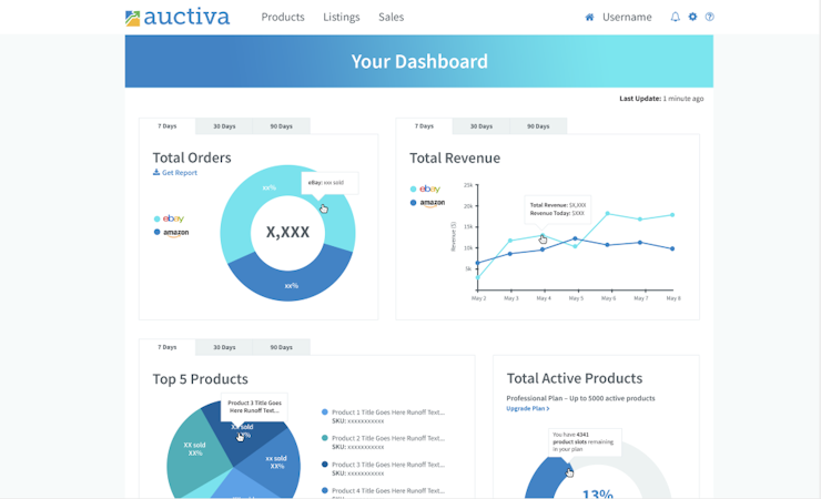 Auctiva’s sales management functionality allows administrators to organize sales data, search past transactions, print shipping labels and packing slips, and purchase insurance. Using the built-in interactive dashboard, managers can gain insights into metrics related to sales, revenue, trending products, active and inactive items, profit from different channels, and more via analytics and charts.