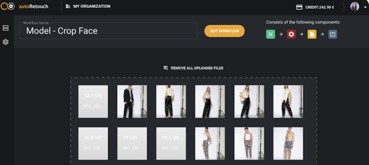autoRetouch supports e-commerce fashion companies by automatically processing product images. Users can chain components from a library to create a customized workflow and thereby simultaneously process up to a hundred images at a time. There are several design options, allowing users to define their own processing sequences without losing any creative control.