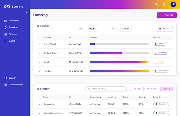 • Simplify payment with ByteNite's ByteChips. Top up your account once with a fixed amount of credits and spend them on encoding jobs. Review each job's price before submitting it and keep track of your transactions on the Wallet page.