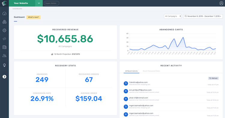 Recovery Campaigns (cart abandonment & browse abandonment emails) are automated and personalized to reengage your lost shoppers and help you recover 20% + lost sales. On-site campaigns (Real-time lead capture, Exit Intent Popups, Send My Cart) monitor your visitors, capturing email addresses for your recovery campaigns and improving your website's conversion rate in real-time. A/B split testing, real-time abandonment notifications, enriched contact reports and abandoned session replays are just a few of the other tools available to help users improve their results.