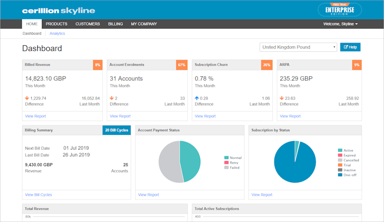 Primary features of Cerillion Skyline include automated payments, financial management, debt management, recovery, metering, usage charging, business intelligence, inventory management, recurring billing and more. The solution allows users to access operational metrics and business requirement analytics with real-time tables and charts. Cerillion Skyline provides a unified dashboard to allow users to track business metrics such as enrollments, revenue, churn, key billing, and payment information status.