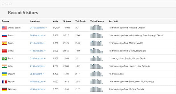 ClustrMaps allows employees to create website widgets with brand colors and custom size, style, and text. It enables organizations to display website statistics across web pages with details, such as visitor IP addresses, referrer information, and a list of visited pages. With the built-in analytics tools, supervisors can monitor returning or new visitors, locations, visit depth, and latest visits.