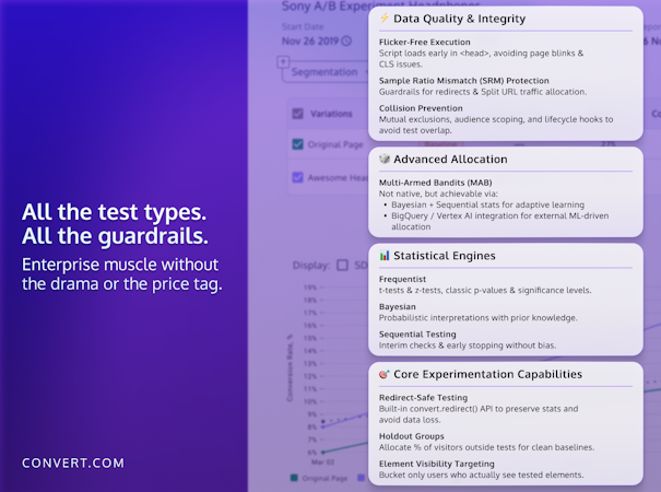 From classic A/B and multivariate testing to split URL and personalization campaigns, Convert makes experimentation fast, accurate, and frustration-free.