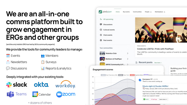 Everyspace is an all-in-one employee engagement hub that focuses on fostering authentic community internally and centralizing communications to better engage + retain employees. We integrate with existing tools like Slack, email, calendar, and more to help HR teams create data-driven engagement programs and measure impact. From organizing your employee resource group budgets or implementing strategy, to managing your L&D training sessions company-wide, we help teams streamline their internal communications and DEI-driven employee engagement efforts through our feature rich platform