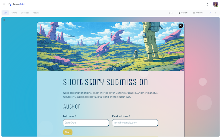 FormGrid includes an AI-driven generation system that produces complete forms based on descriptive user input. Users may describe a desired aesthetic or purpose and receive a fully styled form with configured fields. This approach offers an automated alternative to manual design workflows.