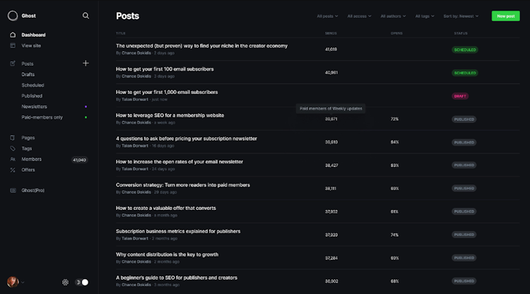 Ghost is a free open source blogging platform that enables businesses to launch their websites or utilize the content management system (CMS) to create an online presence without the need to rely on technical knowledge. It helps bloggers, journalists, YouTubers and podcasters to share their work with the world.