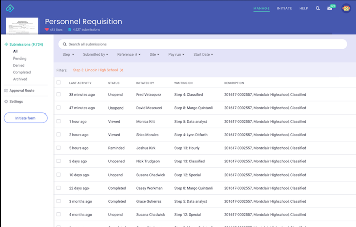 Informed K12 allows administrators to communicate and securely distribute documents among staff members or families. It lets users filter and search for required information, archive inactive forms, download forms in bulk for printing or filing purposes, and export data to create custom reports. Human resources departments can use the solution to handle personnel requisitions, onboarding, leave requests, and more.