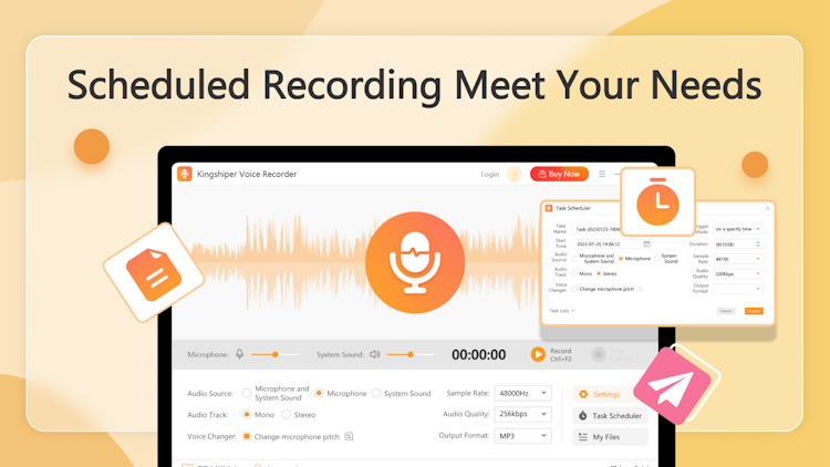 Kingshiper Voice Recorder offers various features, including a task scheduler, recording floating window, pre-recording device check, microphone boost, recording hotkeys, voice changer, and microphone noise reduction. Its multi-recording modes offer options to record system sound, microphone sound, or both simultaneously.