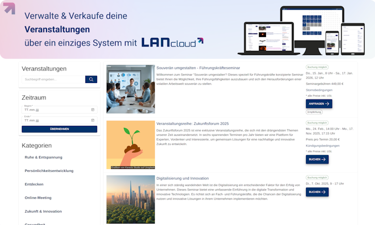 LANcloud is a comprehensive cloud-based management software designed for event organizers, educational institutions, and seminar providers. The platform offers a complete solution for managing various types of events including seminars, courses, coaching sessions, conferences, and holiday programs from planning through execution to evaluation. The system features a fully developed booking portal that can be customized with organization-specific branding, allowing clients to market and sell their events directly through their websites without requiring additional web design services.