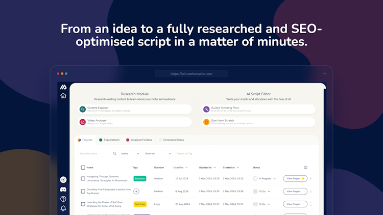 Maekersuite includes a script editor with an AI YouTube script writer, video outline generator, video script editor, and video script writing tool. These features help users create data-driven, optimized video scripts to engage audience. The platform helps research and analyze competitor videos to optimize content, generate optimized titles, descriptions, tags and scripts, writes scripts and outlines, and more.