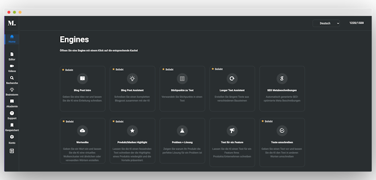 Mindverse is based on an artificial intelligence that calculates unique content every time and provides users with a text that is almost indistinguishable from texts written by humans. You can choose from over 30+ so-called "engines": from blogposts, advertising headlines, slogans and much more. With Mindverse, all users have to do is enter a short input (so that the AI knows what to write about) and the tool will provide them with an error-free and unique text after a few seconds. This text can either be taken directly, or further edited and refined in Mindverse's text editor.