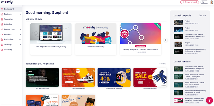 Video Automation: Our tool allows developers to easily integrate its advanced video production capabilities. Using the Moovly API, you can add video production to your own platforms, products and services to create videos based on a list, database, or even RSS feeds.