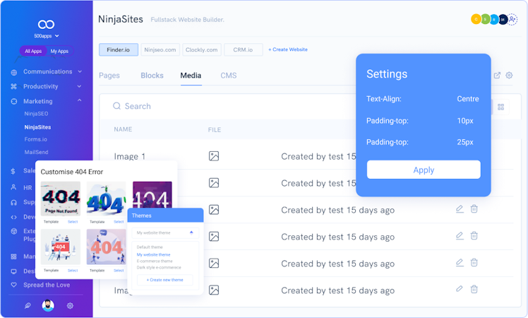 NinjaSites by 500apps is a website builder which lets businesses utilize the drag and drop interface with pre-defined templates, built-in SEO, and more features to design websites with SSL certification.