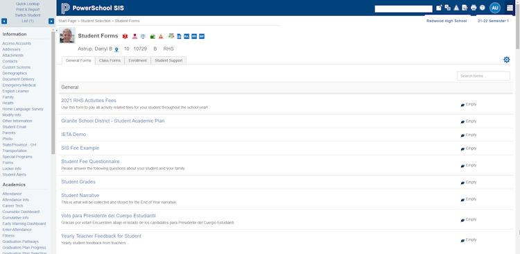 Create, edit, and share online forms to meet your K-12 goals, right from within PowerSchool SIS, with PowerSchool Ecollect Forms. Pull from a library of form templates or create your own forms—even share your forms with neighboring districts! Use it for wellness surveys, e-learning consent forms, device tracking, permission slips, field trips, transportation requests, parent-teacher conferences, and many more!