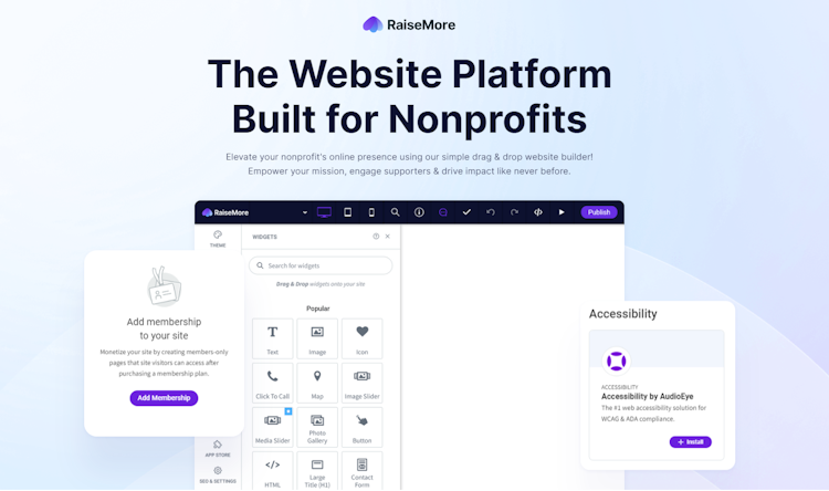 RaiseMore simplifies the process of creating a compelling online presence for nonprofits. The intuitive website editor, equipped with drag-and-drop widgets, makes website building accessible to everyone. Leverage customizable templates to design unique websites and landing pages that resonate with your mission. Benefit from our built-in reporting tools and website automation for actionable insights into user behavior and preferences. Additionally, the platform's SEO enhancements and mobile-responsive designs ensure broader reach and engagement.