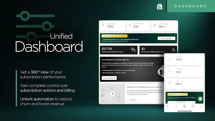 Get a 360° view of subscription performance including total subscribers, active subscribers, lifetime revenue, churn reasons, and upsell revenue — all from one unified dashboard. AI-powered analytics surface actionable insights to help merchants spot trends and make data-driven decisions.