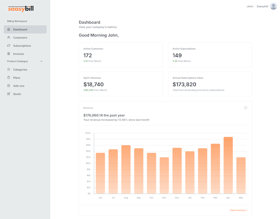 Saasybill supports five distinct billing models to accommodate diverse pricing strategies, including flat fee, per unit, tiered, volume, and stairstep pricing structures. Built in proration capabilities calculate day accurate adjustments automatically when mid cycle changes occur, such as plan upgrades or unit modifications. Monthly and annual billing cycles are processed automatically, with renewal events triggered on the scheduled date for each subscription. Individual pricing rules at the customer level allow custom overrides and plan specific configurations across the customer base.