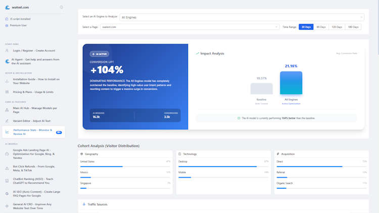 Seatext AI is a comprehensive website conversion optimization and personalization platform that uses artificial intelligence to dynamically adapt website content for individual visitors. The software serves businesses across e-commerce, B2B, and digital marketing sectors that seek to improve conversion performance through automated content optimization, multilingual translation, and visitor-specific personalization. Seatext AI addresses the limitations of static website content by transforming how sites communicate with diverse audiences. It automatically rewrites text based on visitor intent, referral traffic source, language preferences, and behavioral patterns to enhance engagement and sales outcomes.