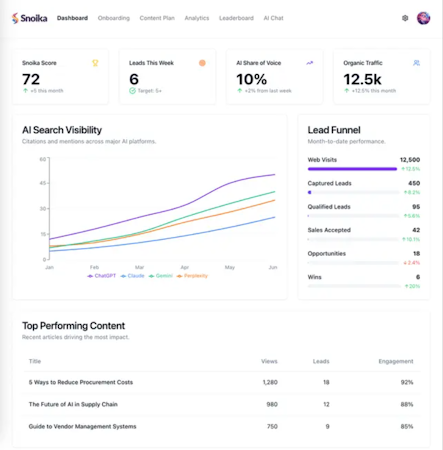 Snoika integrates with major AI platforms including ChatGPT, Gemini, Perplexity, and Claude to monitor and optimize brand visibility. The system's analytics component tracks website performance across thousands of metrics and KPIs to maintain competitive keyword positioning. The platform leverages data connections with major search engines and AI assistants to perform its Synthetic Q&A Benchmark and LLM Mention Tracker functions. The software maintains compliance with emerging AI regulations through transparent data sourcing and AI content auditing processes. Snoika replaces multiple scattered SEO tools with a single integrated platform, providing a unified interface for managing AI visibility, growth metrics, and performance results across both traditional search engines and next-generation AI search platforms.