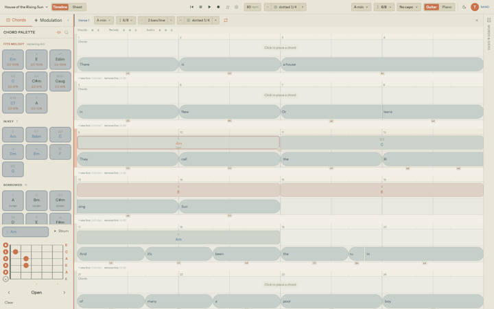 The timeline canvas functions as a drag-and-drop workspace where chord blocks and lyric sections can be repositioned and designated as verse, chorus, or bridge. A sheet view displays chords above lyrics in text format while a timeline view places syllables on a beat grid with assignable pitch values. Melody input snaps to chord tones automatically and highlights scale degrees relative to active harmony. Audio recording captures performances directly within the application and playback includes accompaniment generation based on the chord progression. The lyric workspace integrates word tools that provide perfect rhymes, slant rhymes grouped by syllable count, synonyms, semantically related words, and verb or noun derivatives. An Explore tab features a Word Collider that generates unexpected word pairings to address creative blocks. Unlimited undo and redo operations preserve a complete editing history throughout each session.