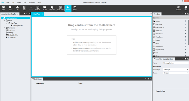 Stadium is a Windows desktop application with a drag and drop interface for designing and generating web apps, which can be deployed and managed within the cloud. The web-based Application Manager allows users to debug issues, generate API keys, update app history, manage logins, configure application settings, and more. The connectors feature enables communication between applications and other services such as databases, file systems on local hard disks or network folders, and web services. Multiple pages can be added to the application, including drag and drop controls such as labels, textboxes, data grids, and drop-downs.