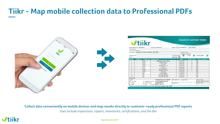 Tiikr is the perfect data collection solution for mobile professionals. With Tiikr, you can collect data conveniently on your mobile device and map results directly to pre-produced, customer-ready professional PDF reports. Reports are complete with business branding, layouts, and corporate designs, making them ready for customer use. Uses include customer-ready inspections, repairs, inventories, certifications, and more.