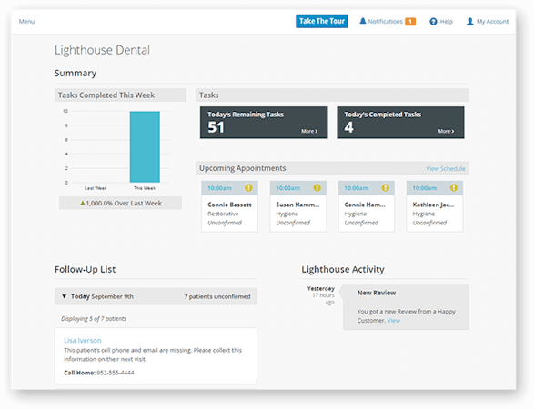 Lighthouse 360 lets businesses send marketing emails to targeted customers and gain insights into reviews posted by patients across various platforms including Facebook and Google. Clients can also eSign digital registration forms and receive message alerts for appointment cancellations in case the dentist is unavailable.